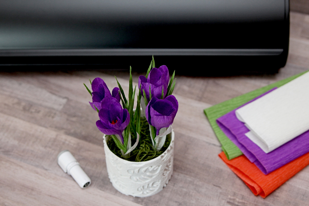 Get to know the Silhouette Rotary Blade while creating beautiful springtime crocuses! Crepe paper is a specialty material that requires the Rotary Blade when cutting with a Silhouette machine. Its textured grain allows for stretching, making realistic blooms, but it can’t be cut with a regular blade.