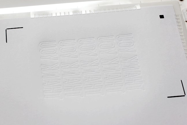 Step 3 has you change mats and flip the page horizontally. You’ll need to remove the cutting mat and the #1 platform, and place your embossing mat on top of platforms 2+2. As you place the printed page face down on the embossing mat as instructed, place the thin plastic black squares that came with your Curio so the black shows through those cut-out registration marks.