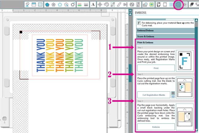 Then on to Step 2 in the Print & Emboss section of the Emboss Window. Be sure to use the Curio cutting mat and the blade with platforms 2+2+1+mat. When you click on the button in Step 2 for Cut Registration Marks, it will actually cut out the registration marks, so don’t freak out if you’re used to regular print and cuts.