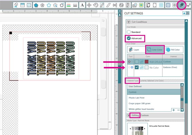 - “Turn on” embossing cut lines by checking the box with the blank line color (for this Thank You design), change it to the right tool holder (blue circle), and change the Material Type to Emboss (Fine) Score & Emboss Paper. Put your Fine embossing tool in the right tool holder (blue circle).