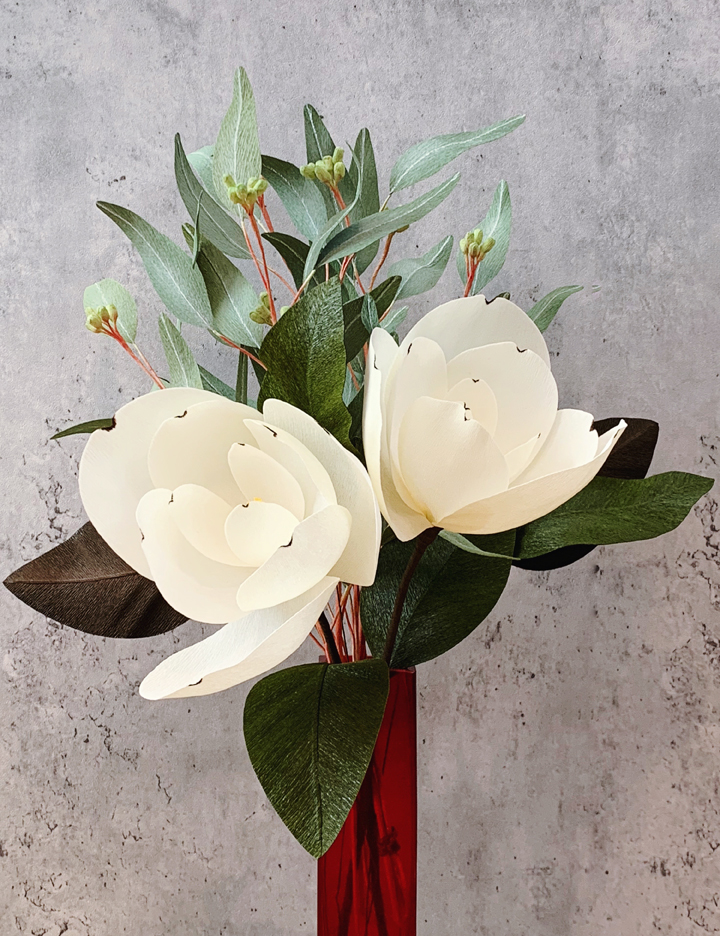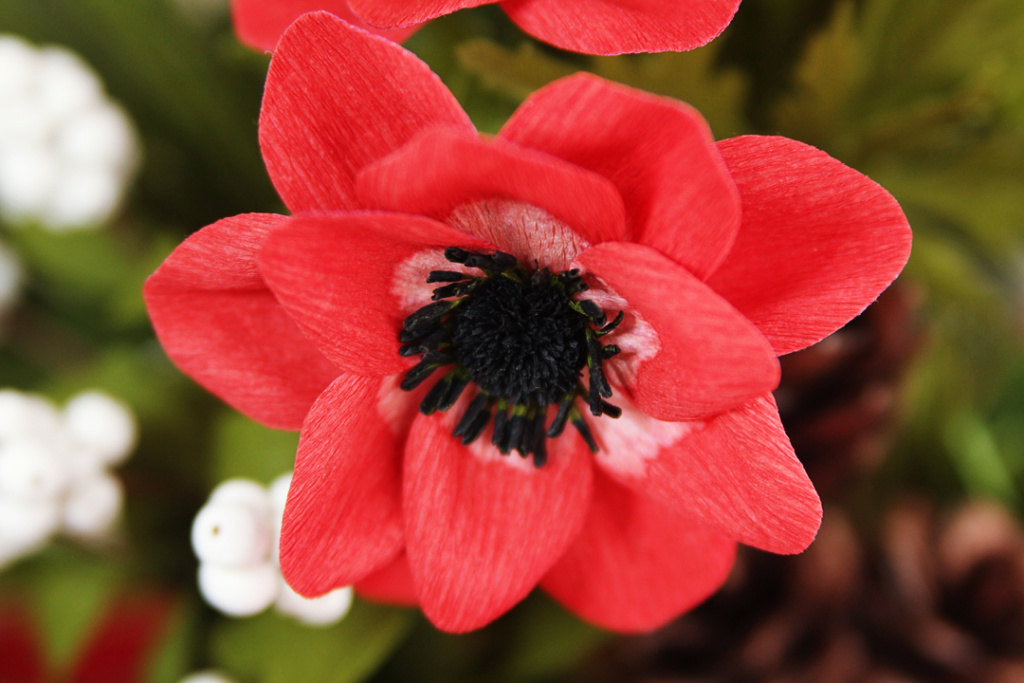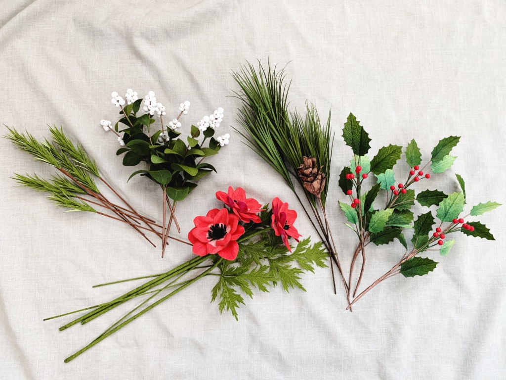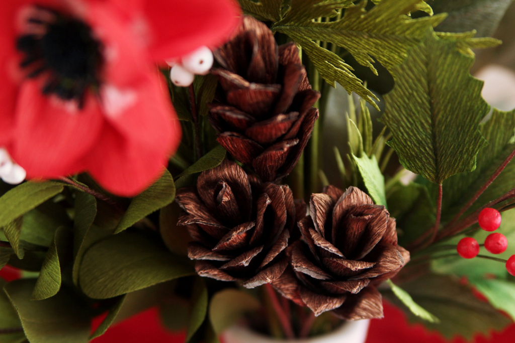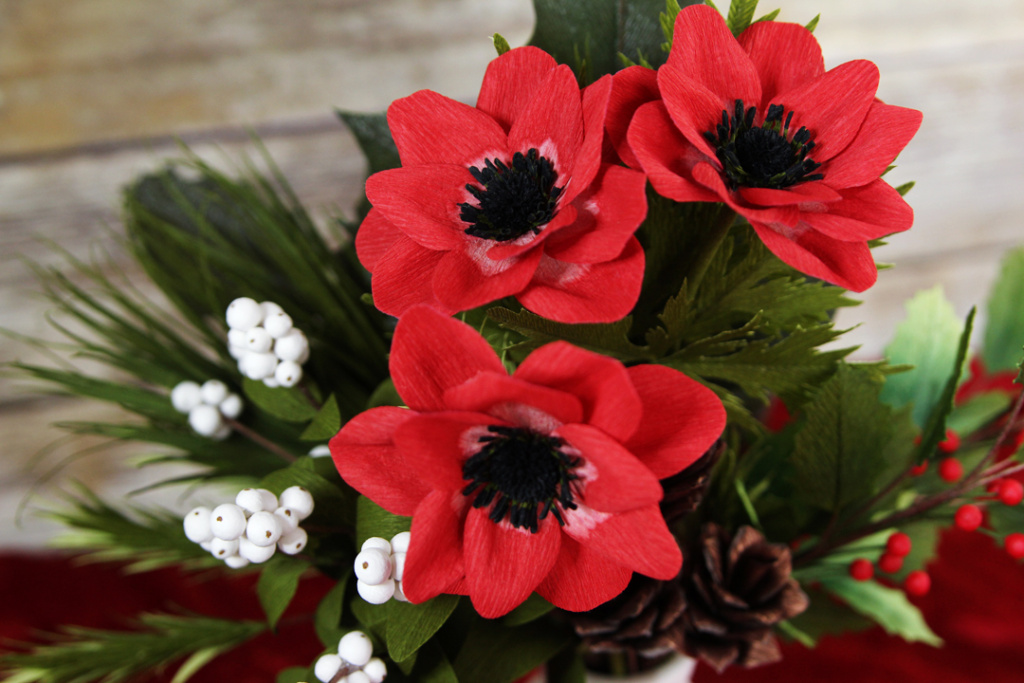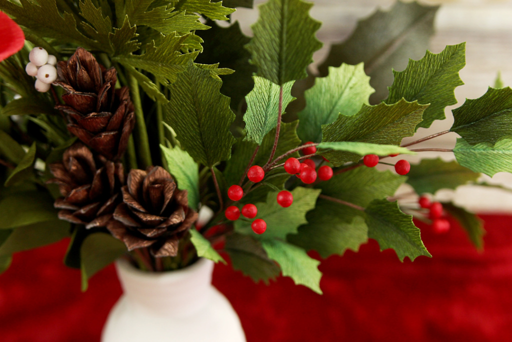 I want to show you what I’ve been working on this winter! I’ve made all these crepe paper holiday flowers and greenery for winter arrangements. These are all made from templates and instructions on the Lia Griffith website. I meant to post this before Christmas, but the season got away from me, as it always does. But the pictures are still pretty, so here they are!