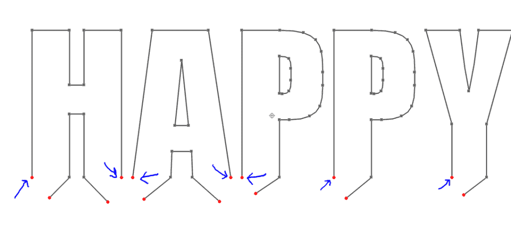 Update: Here is an extra image showing which point to click on for breaking the paths in each letter of HAPPY. If the letter has two parts or “legs” at its base, choose the very lower left point (then break the path and drag the line away) and also the very lower right point (then break the path and drag the line away). This is before I delete any points: