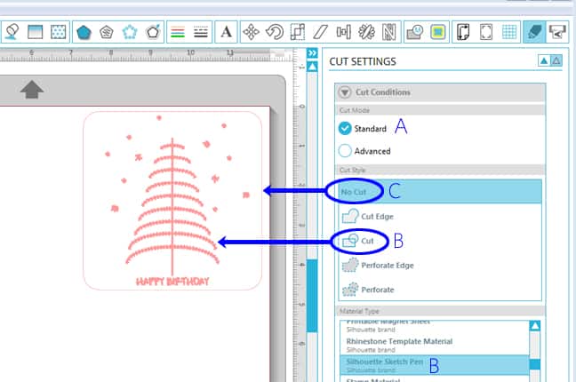 - With the sketch design selected, choose Cut for the Cut Style. Also select Silhouette Sketch Pen for the Material Type. (B)