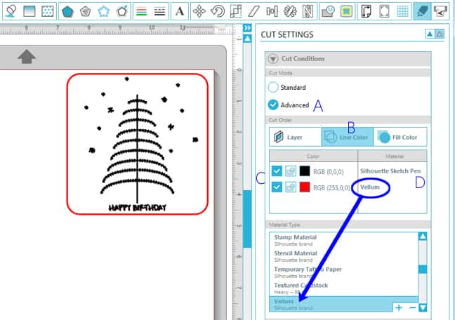 - Click on the colored box (or to the right of it) to select that line color’s Material Type. In this example, choose Silhouette Sketch Pen for the black sketch color and Vellum for the red cut color. (D)