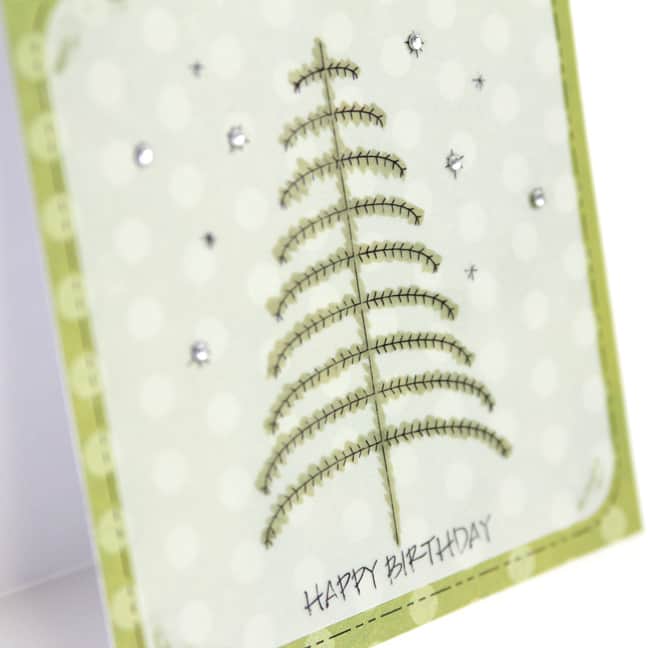 The tree design is resized here to approximately 3.64” W x 4.05” H. I used my Text Tool to type out “Happy Birthday” in all caps with Jeana Sketch font. I created a rounded rectangle exactly 4.5” square with my rounded-rectangle drawing tool (hold Shift while dragging a red corner dot to alter the roundness of the corners). I created a 0.066” offset of the rounded rectangle and then changed its Line Style to a funky dashed line. Finally, I drew a 5” square for the card base with my rectangle drawing tool.