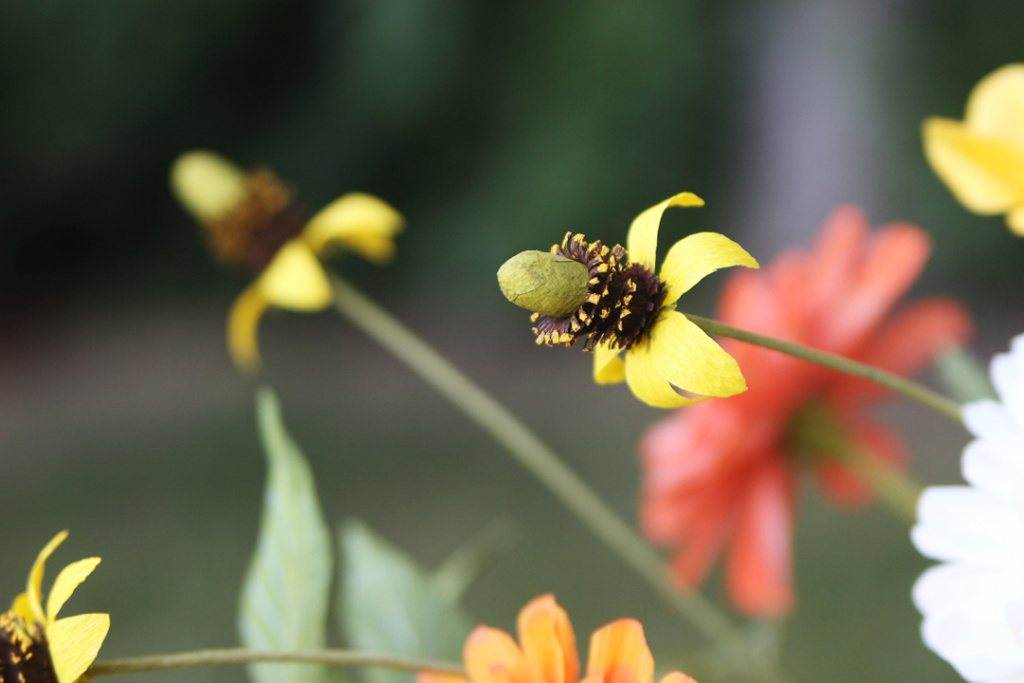 I started with zinnias from a Lia Griffith zinnia template using the blush color and red centers, but I just kept making more and more zinnias. I went by photos I had taken in my zinnia garden mix last summer. These white/green zinnias turned out to be some of my favorites. The arrangement includes zinnias in blush pink, bright purple, orange, bright pink, and white.