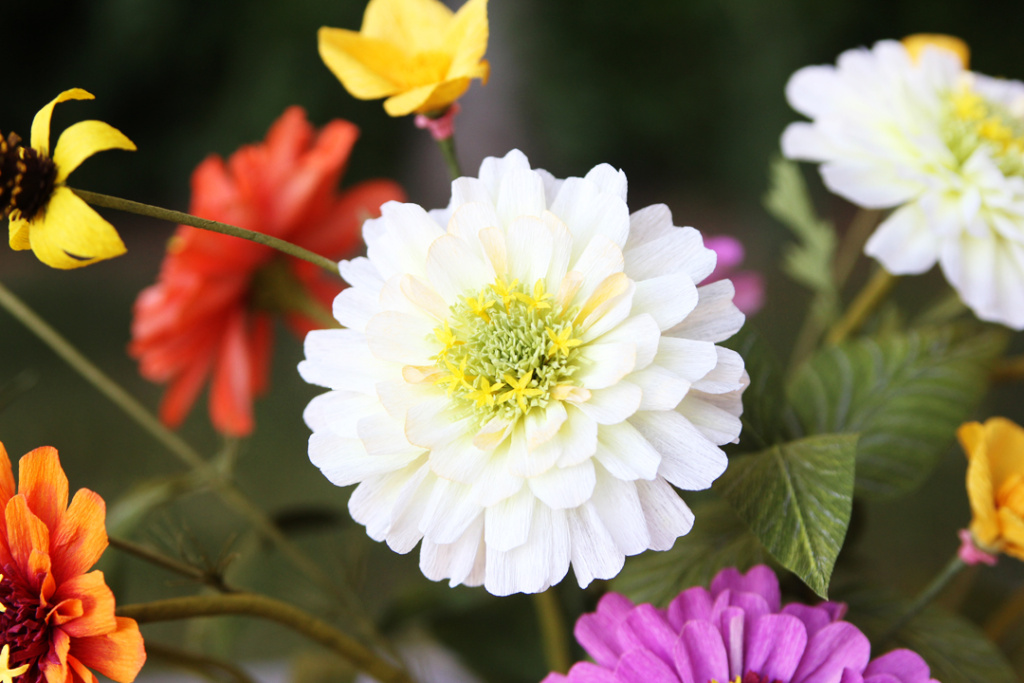 I recently made this crepe paper zinnia wildflower arrangement and want to share it with you! I entered it in our local 4th of July quilt & art show (mostly quilts) and won second place in the art competition based on attendee votes.