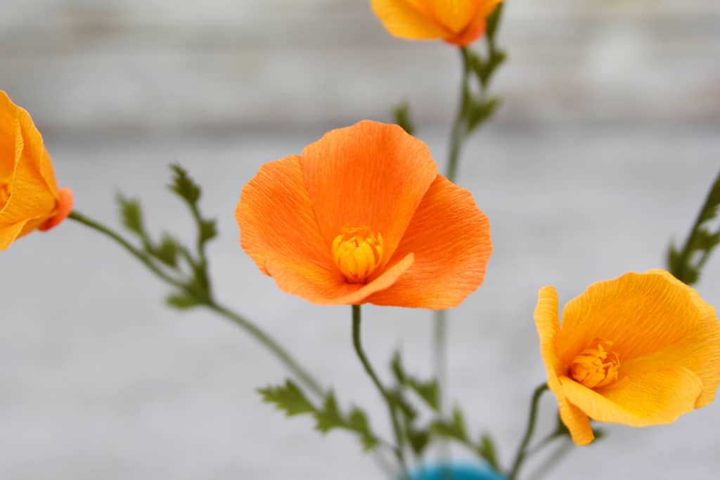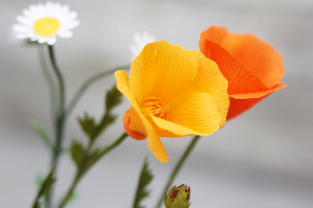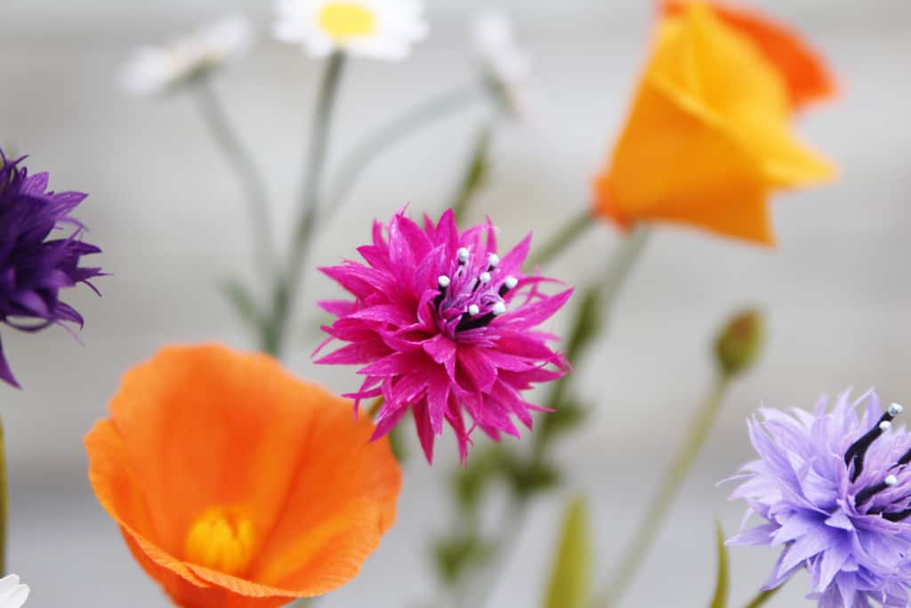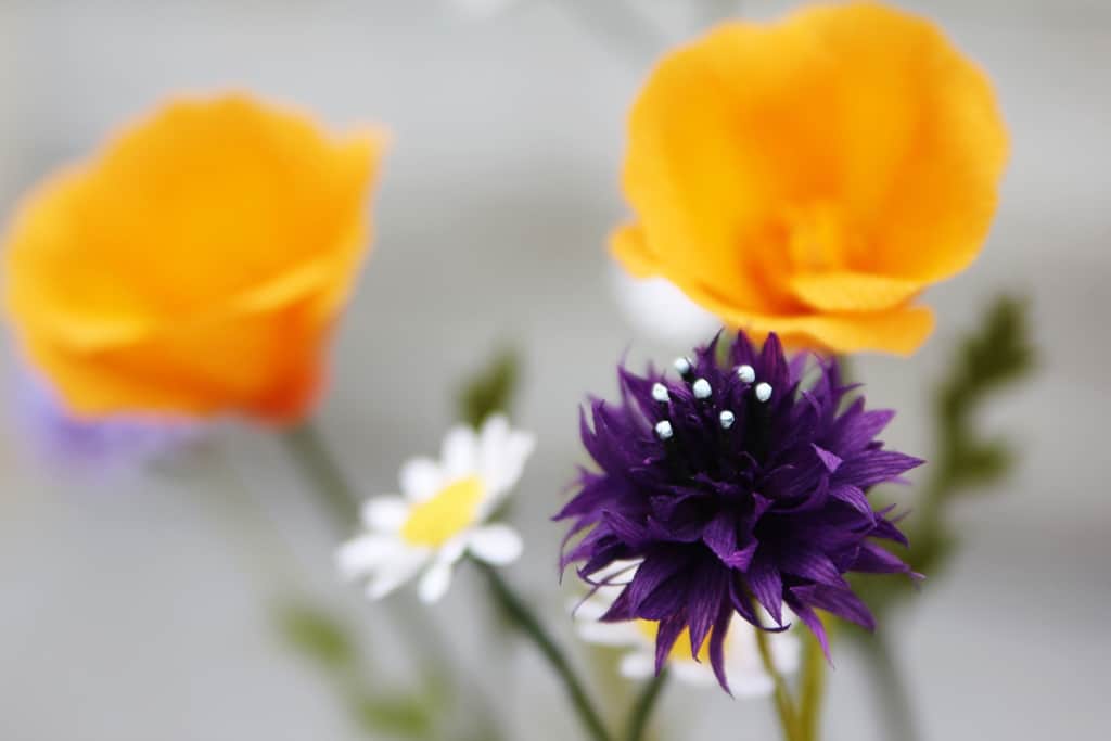 Today is show and tell! Well, mostly show. I’ve been working on three different handmade paper wildflowers: cornflowers for fun, California poppies for a gift, and daisies for an upcoming Silhouette class. They won’t stay together in this arrangement, but they are so pretty together that I might make more after I split these up.