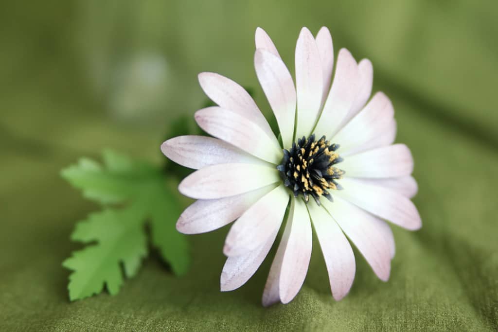 I used a 6 mm ball tool to press the centers in for the daisy petals, but most of those petals I finger-shaped once the flower was assembled. As shown in the Maison Gregoria tutorial, I used that same ball tool to turn the green calyx into a cupped shape before gluing to the bottom of my assembled flower.